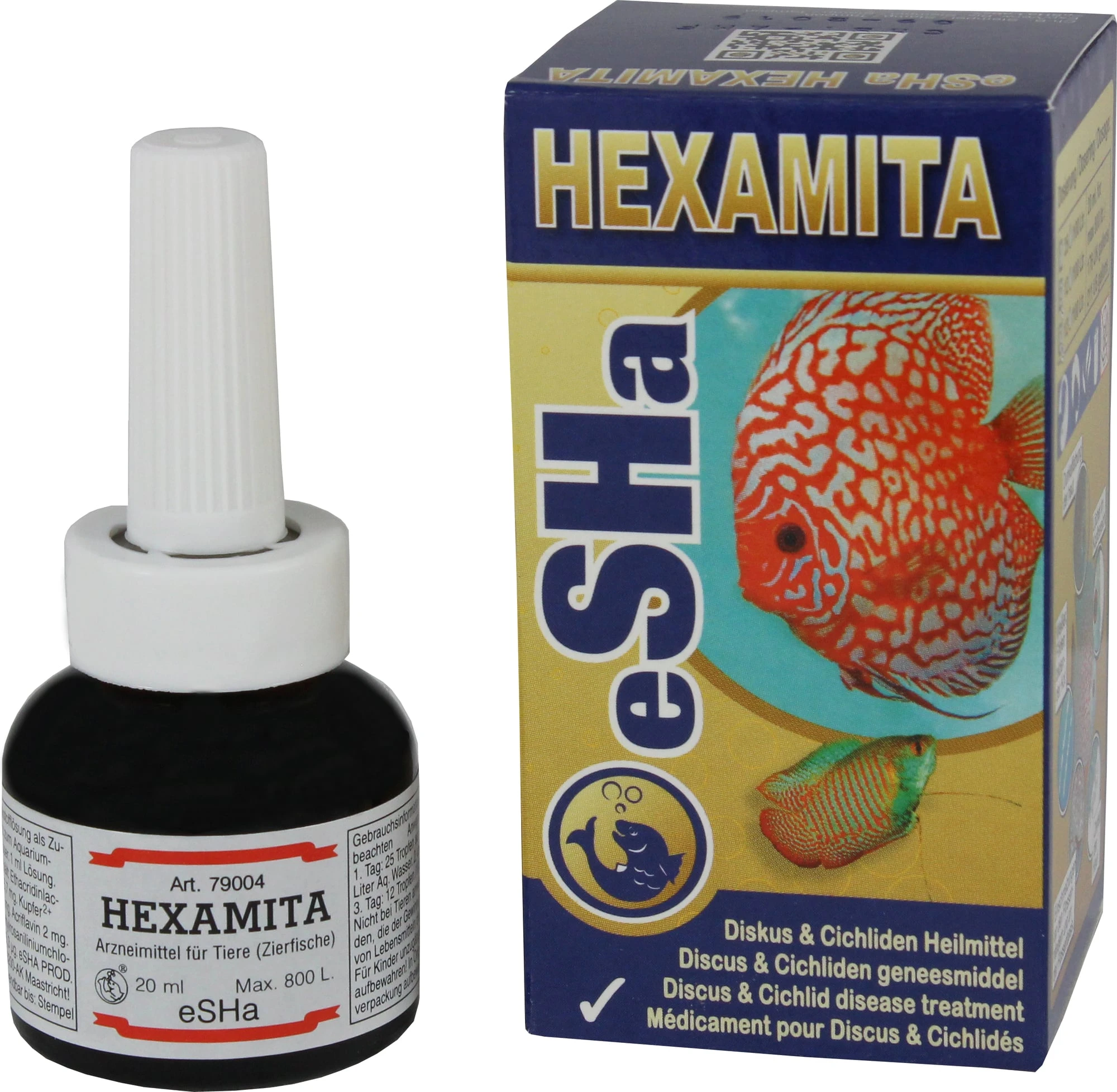 eSHa HEXAMITA představuje přípravek, kterého si chovatelé terčovců a cichlid obzvláště cení. Největší problém, se kterým se setkávají pěstitelé cichlid, terčovců, skalárů a tlamovců, jsou jejich často se vyskytující nemoci. Tím, že ryby nežijí v optimální vodě, snižuje se jejich odolnost a stanou se tak snadno obětí nejrůznějších parazitů jako je Octomitus, Hexamita atd. Ti způsobují onemocnění triviálně nazývané “děrovitost”. Přípravek eSHa HEXAMITA pozměňuje vodu akvária v příznivém smyslu pro ryby a má na ně velmi pozitivní vliv.