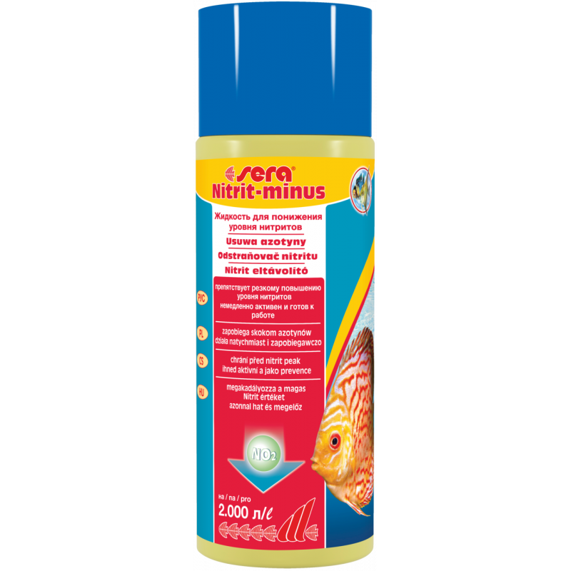 Hromadění nitritu ("syndrom nové nádrže") je hrozbou startovací fáze nového akvária, po léčebném procesu nebo výměně filtru, protože je přítomný nedostatek filtrační bakterie pro rozklad jedovatého nitritu na živinu rostlin nitrát. Pro ryby může být již hladina nitritu 1,0 mg/l škodlivá. sera Nitrit-minus poskytuje rychlou pomoc při akutním zatížení a ihned odstraňuje až 1,5 mg/l nitritu jednou dávkou. Přitom přeměňuje jedovatý nitrit na organické aminy, které jsou pak využívány filtračními bakteriemi. sera Nitrit-minus je velmi dobře snášen okrasnými rybami, bezobratlými a rostlinami a lze ho předávkovat až 5 krát.